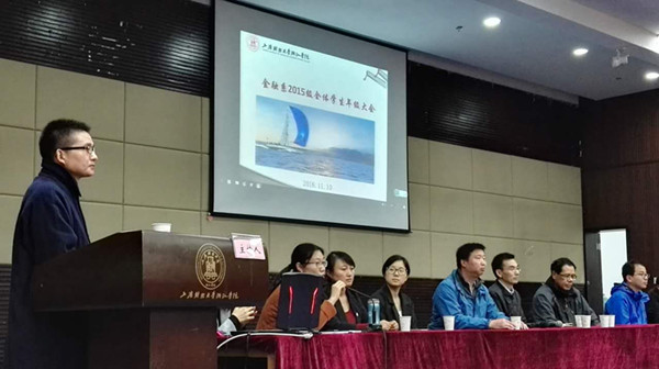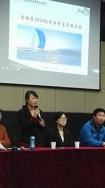 金融系主任李健老师在师生交流大会上寄望2014级同学和2015级同学,希望金融子们积极尝试多元化发展,自主学习市场营销、法律等方面的知识,让自己成为适应时代的多元化全面发展人才。