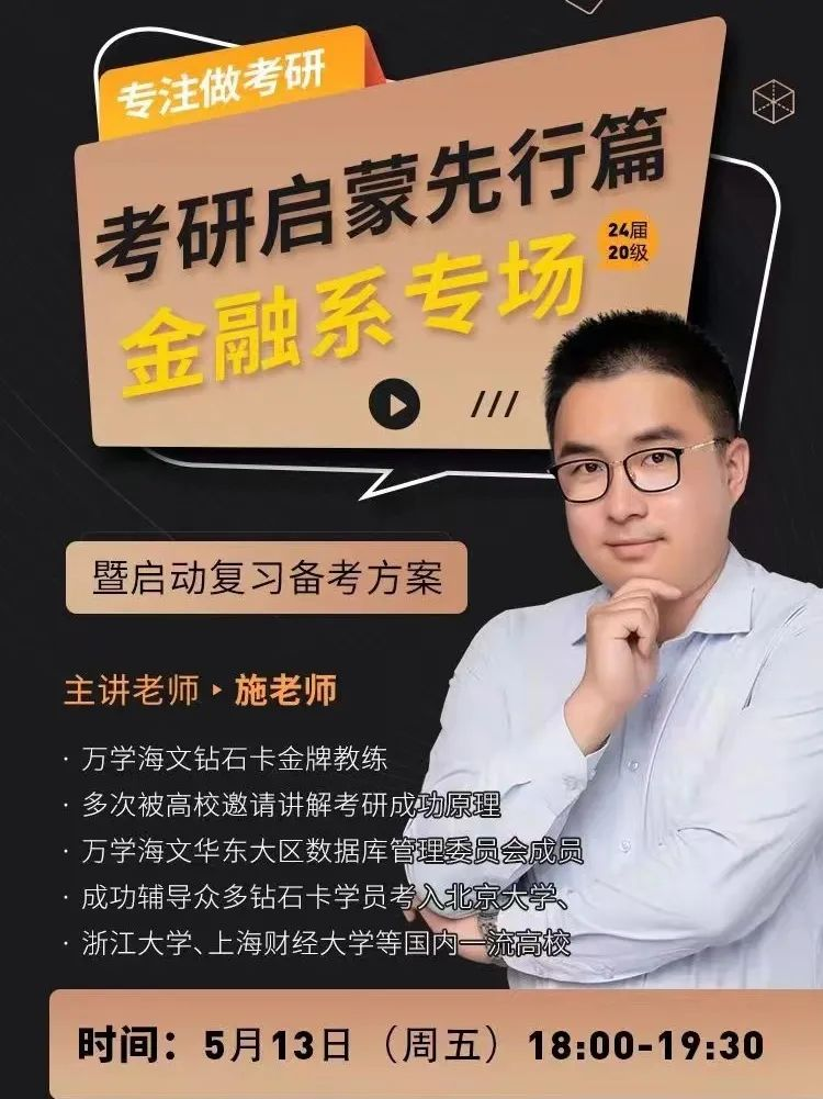 为助于同学们对于考研情况的了解,5月13日晚18:00-19:30, 我系邀请了施子尧老师开展了“金融专业院校分析”讲座,从专业院校选择、学习计划制定、专业课参考书目选择等方面进行细致的介绍。