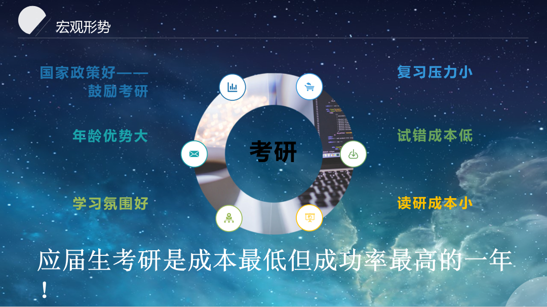 老师首先从当今考研的宏观形势引入,应届生在政策、压力、成本、学习氛围等方面都有着很大的考研优势,所以应届考研是个很值得考虑的选择。而对于我们专业适合的经济类(金融类)考研专业方向来说,虽然竞争压力较大,但薪资待遇以及就业发展都有良好的前景。