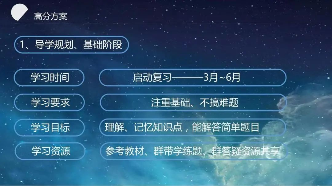 高分方案可分为基础阶段、强化阶段、专项提升与高分突破阶段、超级冲刺阶段四个阶段,进行由浅到深的学习。