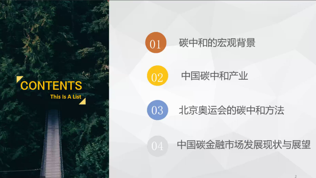 本次讲座分为四个部分——碳中和的宏观背景、中国碳中和产业、北京奥运会的碳中和方法、中国碳金融市场发展现状与展望。