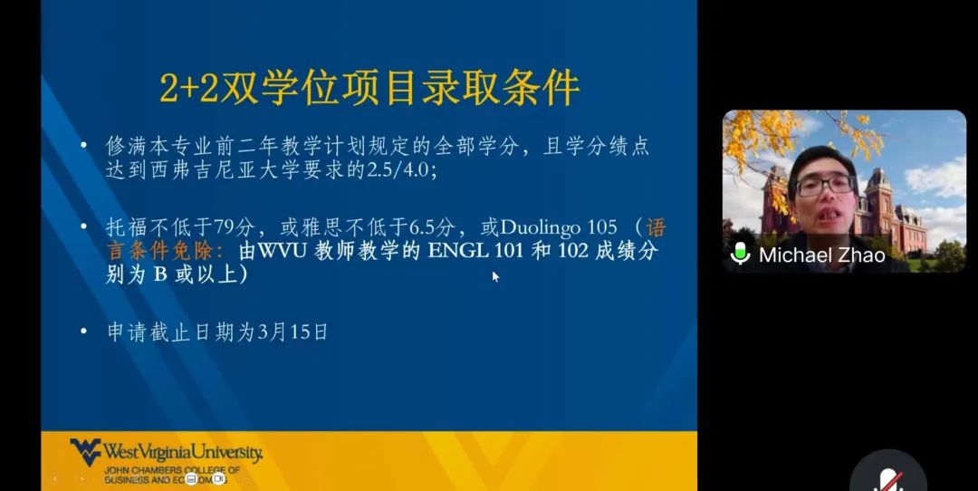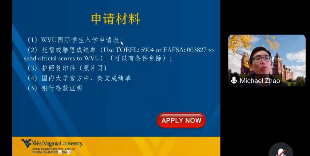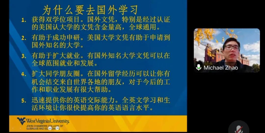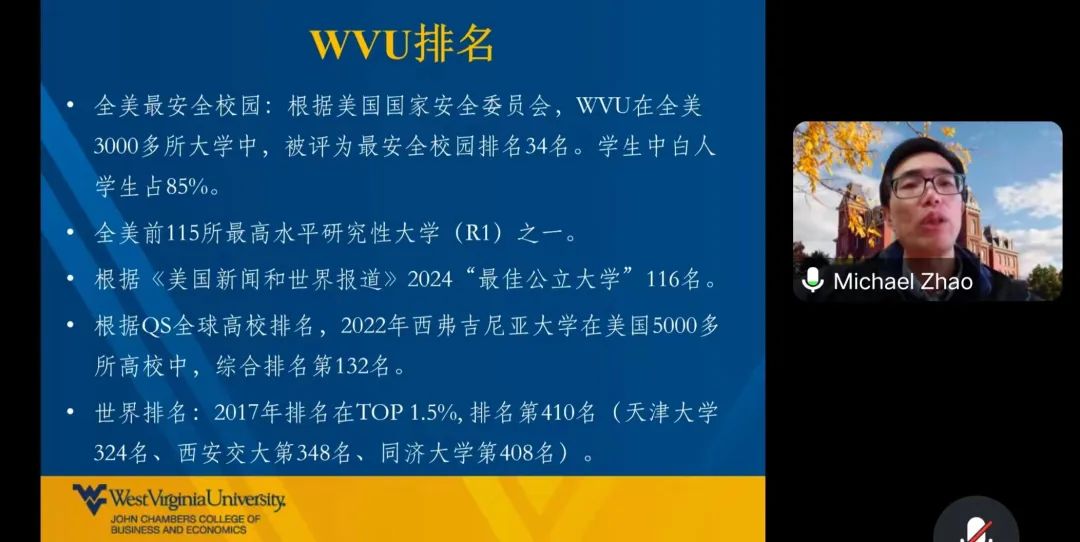 接着,老师对西弗吉尼亚大学(wvu)的基本信息进行简要概述。该校是一所综合性公立研究性大学:配套设施完善,教学资源雄厚,且QS全美排名第132名,还与全球50个国家、150多所院校均建立了合作关系。他又向同学们展示了政策红利,缓解大家对未知事物不确定性的担忧。
