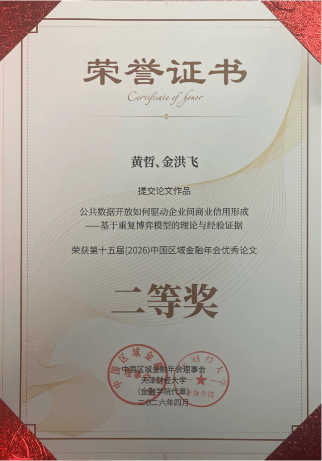 近日,第十五届(2026)中国区域金融年会在天津财经大学举行,我院金融与经济学院教师黄哲凭借学术论文《公共数据开放如何驱动企业间商业信用形成——基于重复博弈模型的理论与经验证据》,在全国参评成果中脱颖而出,荣获优秀论文二等奖,彰显我院青年教师卓越学术水平与科研创新能力。