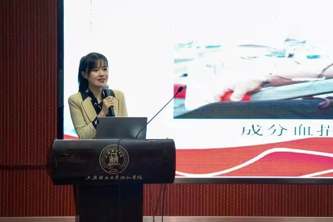 2022年3月24日,上海财经大学浙江学院金融系第二学生党支部书记洪忱姝于图书馆报告厅宣讲了中国共产党金华市第八次代表大会的相关内容。