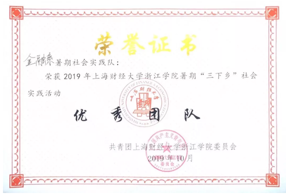 最终,我系融耀暑期社会实践队荣获上海财经大学浙江学院暑期“三下乡”社会实践优秀团队,感谢融耀实践队员的辛勤付出。