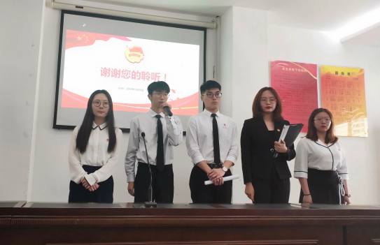 我系学生会主席包书鸿通过ppt演讲展示,以“活力新金融,共筑团学梦”为主题,以“一体五翼”为框架,从党建带团、青马工程、三青工程、媒体矩阵、从严治团五个方面汇报了我系团总支学生会在这一年的活动成果。在答辩环节,主席团的成员们简明扼要地回答了老师们的提问,带领大家进一步了解我系的团学工作。经由院团委书记徐天南老师、各系团总支学生会指导老师、院团委学生会主席团等评委进行打分,我系团总支学生会荣获“2018-2019学年标兵团总支学生会”称号。