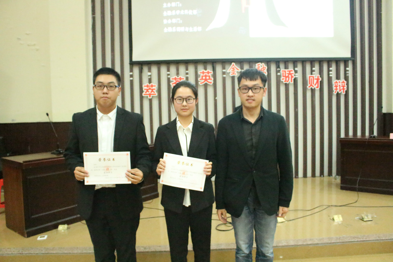 活动的最后,评委们为获胜队伍以及最佳辩手颁发证书并合影留恋,至此我系"金英荟萃,融骄财辩"辩论赛顺利落下帷幕。辩论赛给同学很好的机会,去深入思考问题,同时为大家提供了一个关注生活,共同探讨的平台。本次活动不仅展现金融学子的辩论风采,也让席下的同学学到了很多辩论时实用的技巧,受益匪浅。期待我系学子在院辩论赛时大放光彩!