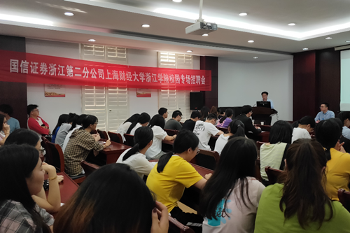 国信证券浙江第二分公司总经理楼青生动地讲述自身的证券从业经历、公司的业务以及人才选用方面的基本情况。并提到国信证券入岗职业培训、业务培训以及专岗培训体系逐渐完善,已形成一套健全的人才培养体系,国信证券欢迎毕业生加入团队,共创辉煌。宣讲会后,应聘学生踊跃投递求职简历,工作人员现场安排进行了第一轮面试。