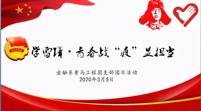 3月5日是全国第57个学雷锋日,第21个“中国青年志愿者服务日”,金融系青马工程团支部“学雷锋· 青春战疫显担当”主题团日活动在腾讯会议室举行。抗击疫情期间,学员们齐聚线上,弘扬雷锋精神,致敬在抗击疫情中无私奉献的志愿者。