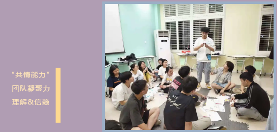 本次团辅主题为“登天的感觉”,希望借由本次团辅帮助大家学习和理解“同理心”,这是帮助别人和理解自己的有效途径。通过“破壳”的这一暖场活动,轻松开启本次活动。第二环节——勒是雾都,通过对投射卡牌的相同描述寻找同组组员,推动同学们去寻找不曾了解过的、有“共鸣”的组员,在寻找朋友的过程中帮助同学们理解自己的喜好。紧接着,通过“一姓一传奇”,分组完成后让组员们共同商讨组名、组内规则、组内昵称。建立团队规则,加深认同,可以连结升华至班级团体文化认同感;