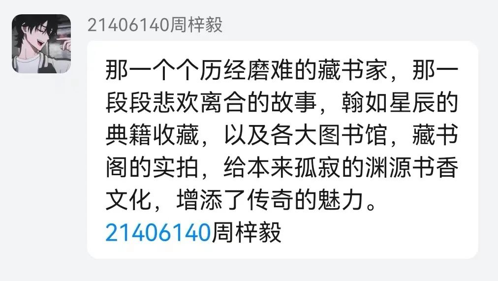 这部纪录片让我们领略到了藏书家们的藏书历程和收藏旨趣,并体味到了其宽广的人生情怀及胸襟气象。