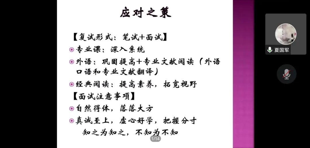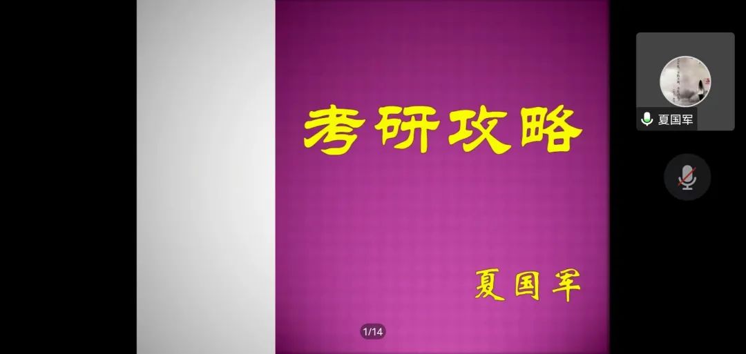 4月10日晚18:30,我系在线上腾讯会议举办了由夏国军教授主讲的“考研心得交流讲座”,为我系学子提供了详细且实用的考研攻略。