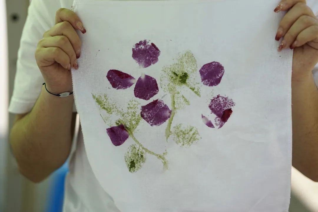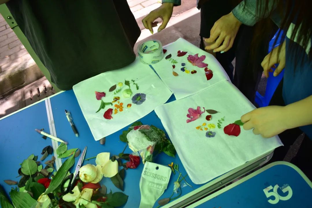 花瓣,落叶和祝福,本次周年活动共分为两个部分,其一,同学们将已备好的落花、落叶放在手帕上,在小锤子的轻轻捶打下,花瓣和叶子的原汁溢出,伴随着淡雅的芳香,独属于大自然的颜色与图案便在手帕上悄然入绢,在“天然去雕饰”的自然之美中,感受春日的美好。