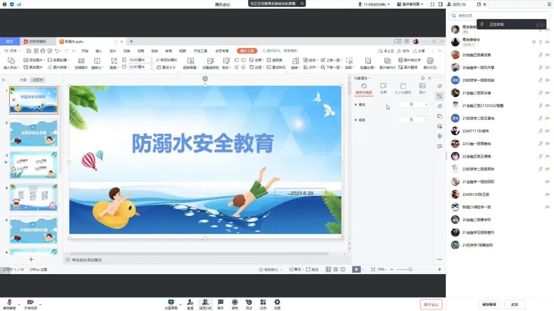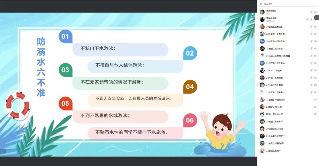 6月29日晚七点半,全体生活委员参加了“防溺水安全教育”的线上会议。