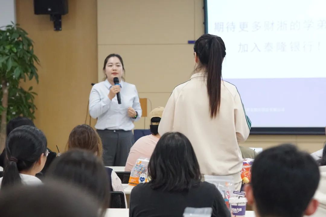 陈老师诙谐明快的讲解带动了学生的整体氛围,同学们提出的疑问也被周到地解答,同时还收到了泰隆银行拥有温度的伴手礼。