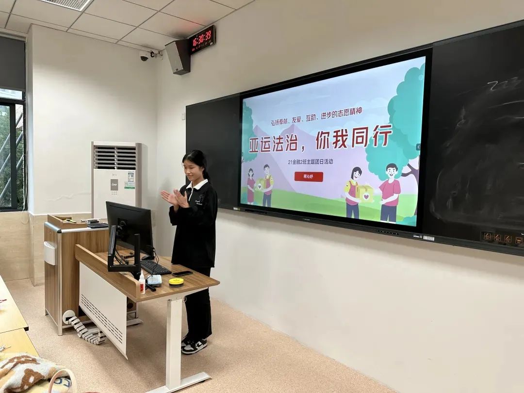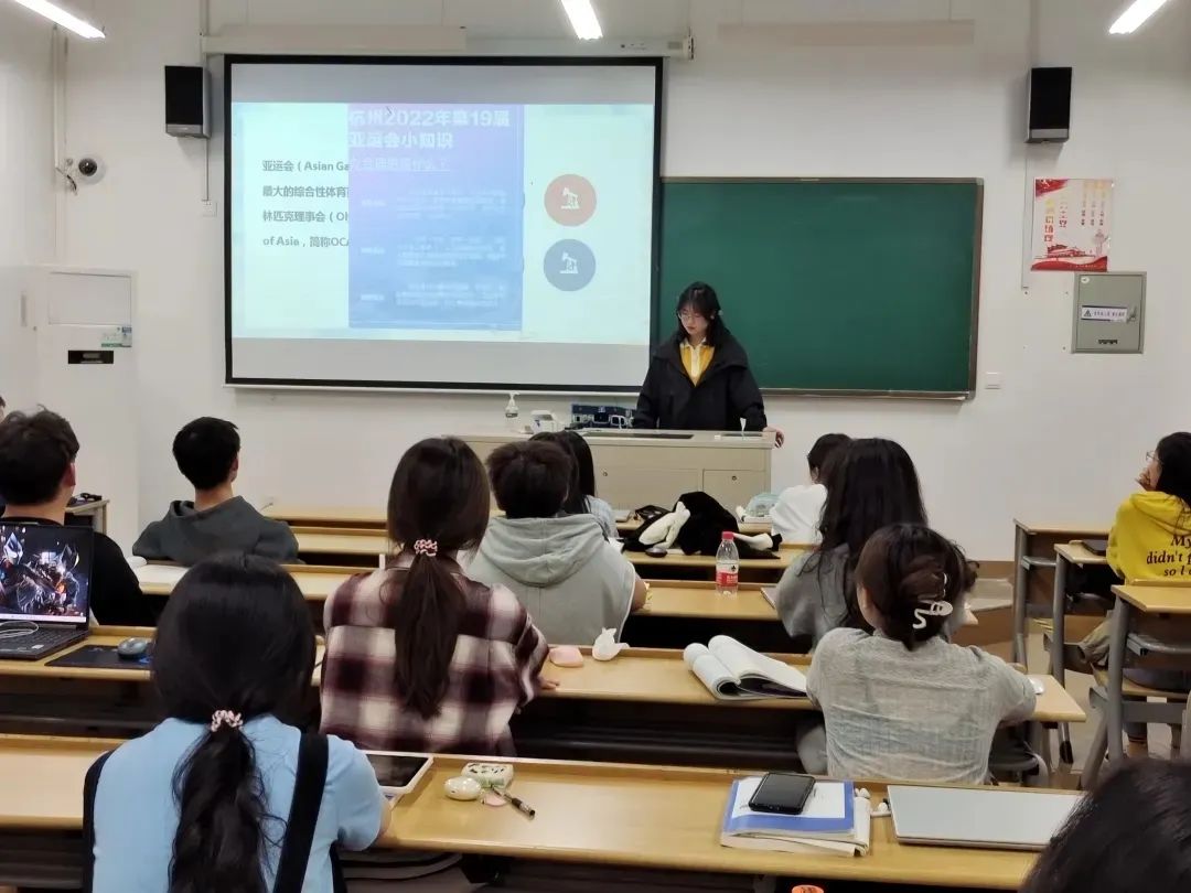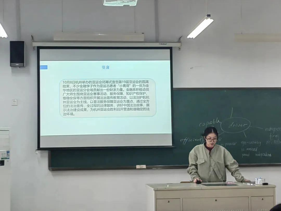 本次活动分为两大模块,分别介绍了亚运会及法治知识。在简单介绍完亚运概况后,团支书还带领同学们探索了亚运会所蕴含的法治元素,随后普及了一些值得关注的法律问题。紧接着进行了知识问答环节,最后进行了亚运会宣传片和亚运会主题曲的展示,极大地增强同学们民族自豪感的同时推动了法律知识的宣传工作。
