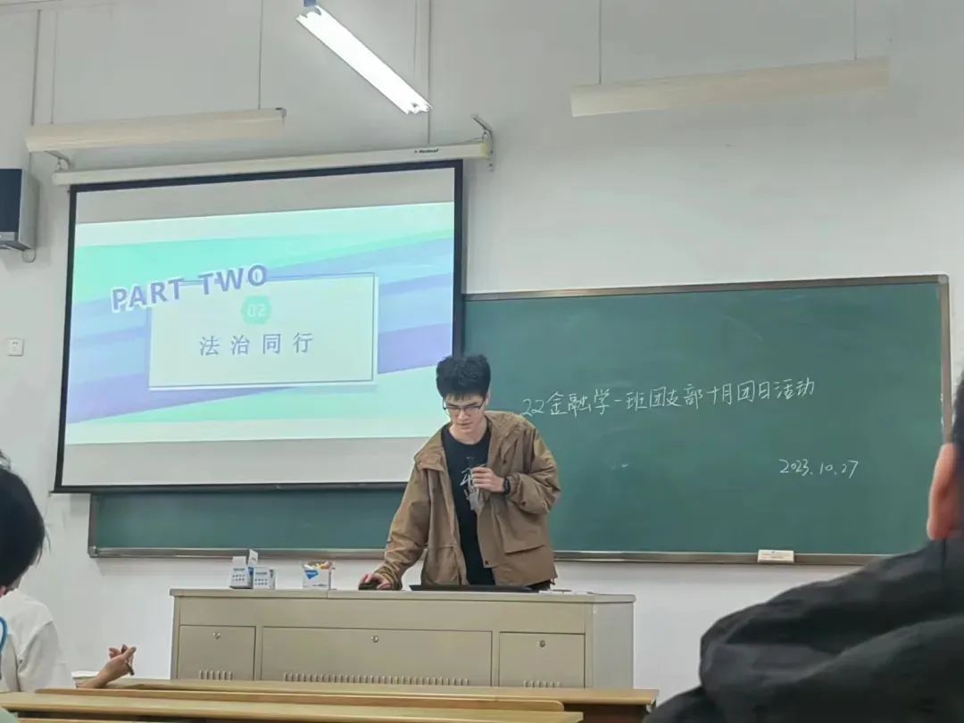 团支书带领同学们深刻理解了亚运会不仅是一次体育盛会,也是一场法治精神的传播盛会。同学们通过亚运会宣传视频,看到了一个丰富多彩的城市。接着在提问环节中加深对亚运和法治的记忆,也学习了关于知识产权的相关案例,扩充了自己的知识面。此次团日活动同学们都有很大的收获,明白自己的责任和价值。