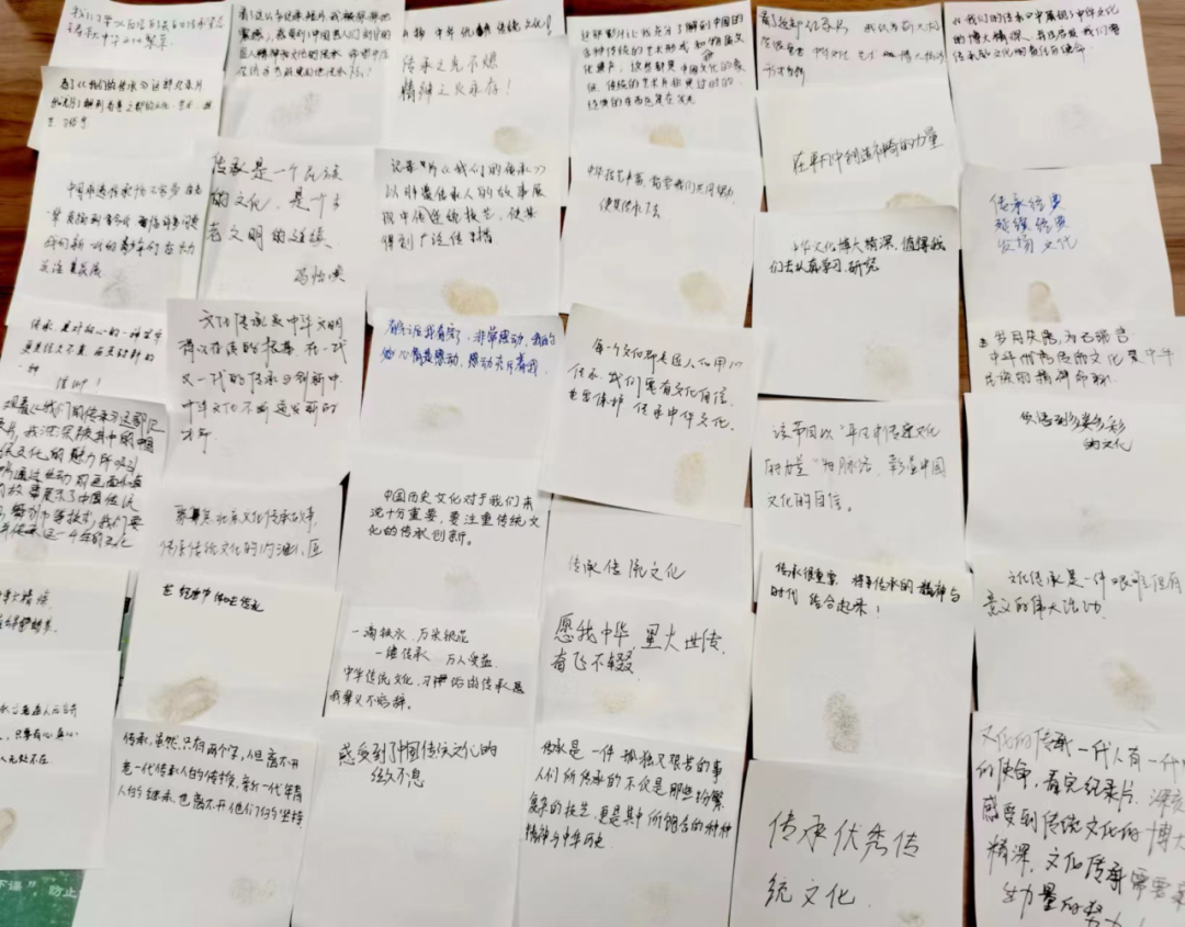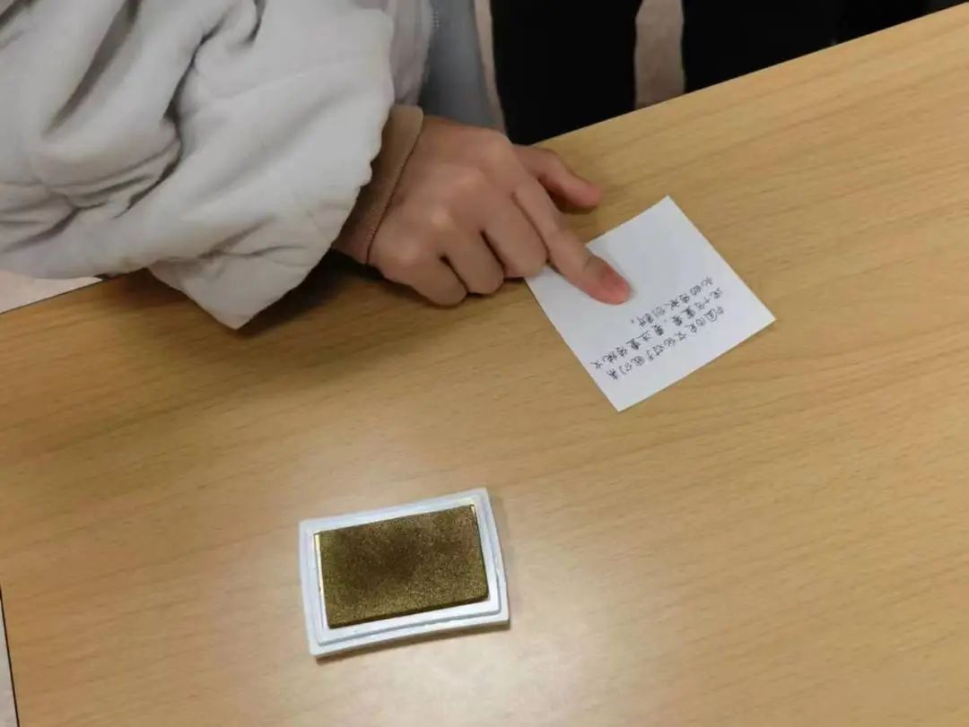 影片结束后,我们为同学们发放了便签纸和笔,让大家在便签纸上写下自己的观影感受,并依次按下自己的“金”手印。