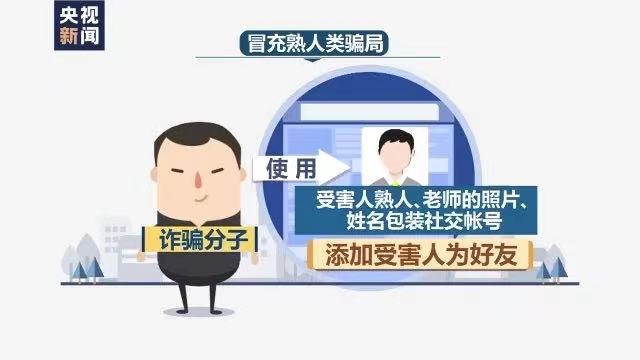 诈骗分子使用受害人熟人、老师的照片、姓名包装社交账号,添加受害人为好友。以熟人的身份对受害人嘘寒问暖表示关心,或模仿熟人、老师等人语气向受害人发出转账或缴纳费用的指令信息,并以时间紧迫、机会难得等借口催促受害人转账。