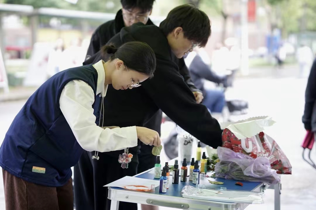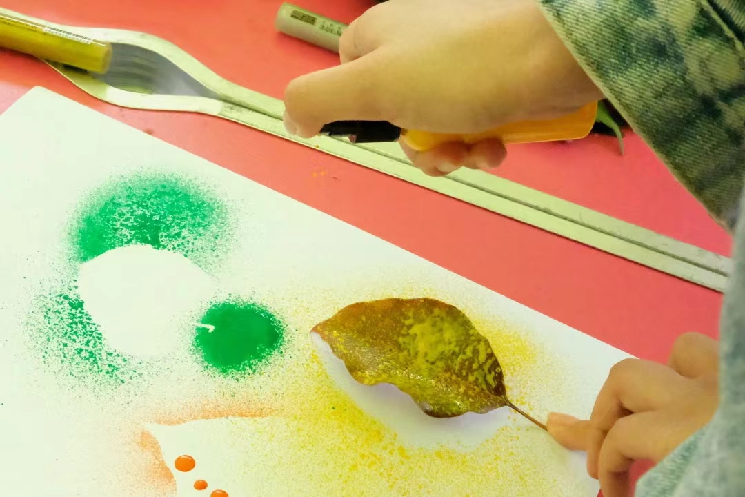 本次周年活动共分为两个部分,其一,同学们从准备好的落花、落叶中挑选出独属于自己的那部分“记忆”,轻轻铺平在纸上,任其享受着颜料在春日下肆意的碰撞,洒下点点星斑,书写着我们之间不可言说的浪漫。