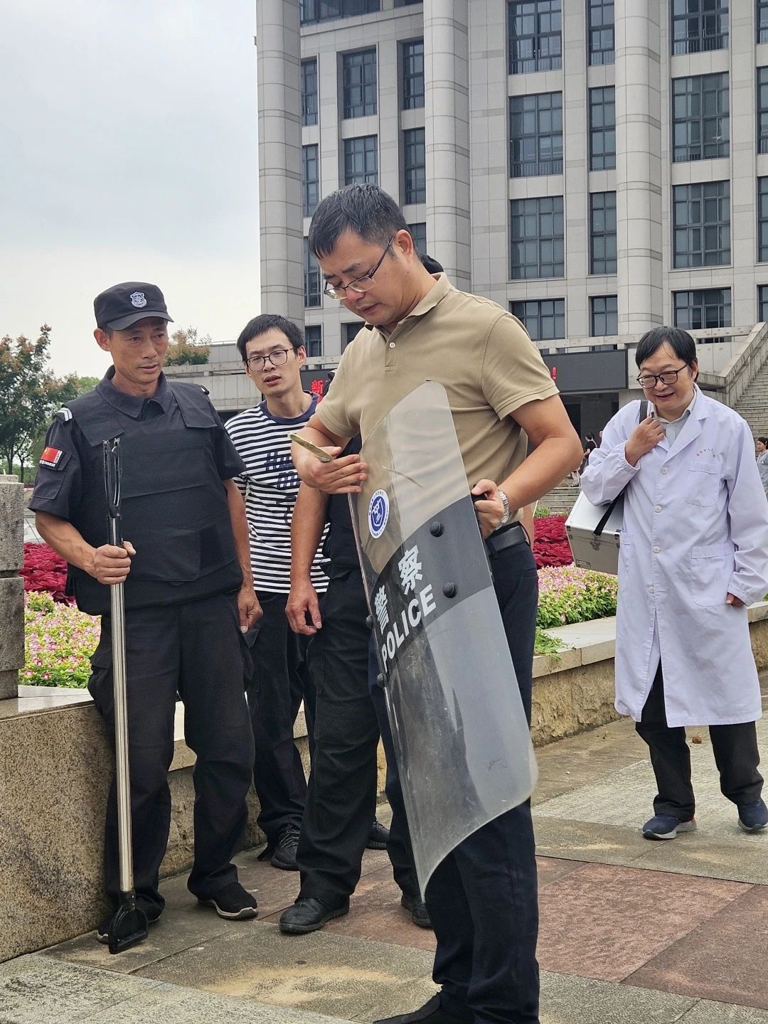 演习结束后,安全保卫部缪明礼老师对演习所出现的问题进行了相关总结,强调学生在面对恐怖分子时要第一时间逃跑、安全保卫部需要加强体能训练等等。缪老师在现场还讲解了盾牌、钢叉等防暴器械的正确使用方法,安保人员在学习后进行了现场实操,提升了相关的防暴技能。