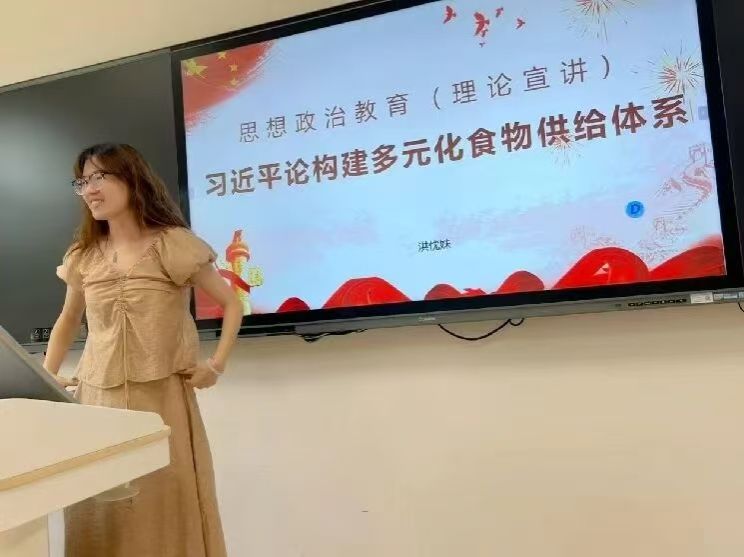 3.引领青春护粮行动为引导学生树立国家粮食安全意识,洪忱姝老师开展了习近平论构建多元化食物供给体系主题思想政治教育。本次宣讲启示青年学子:珍惜粮食、践行“光盘行动”是基础;关注农业科技、生态农业是方向。让同学们从校园做起,为端牢“中国饭碗”、满足人民美好生活需要贡献青春力量。