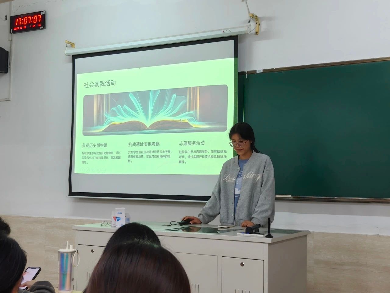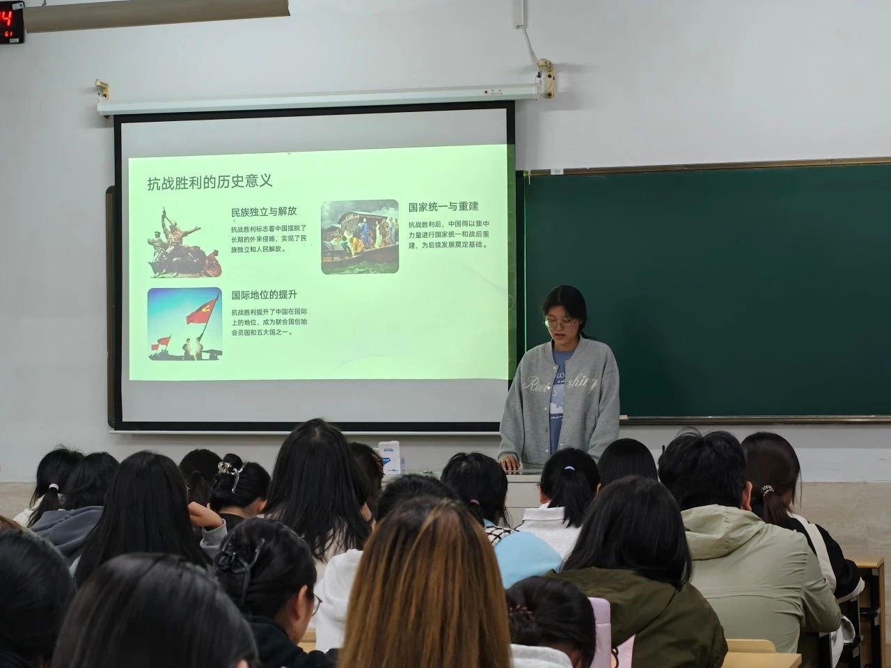 宣讲员刘欣同学围绕抗战胜利80周年的历史意义、如何让红色血脉在新时代青年中延续等方面,带来一场震撼人心的分享。此次宣讲,让我们深刻感悟到英雄们为家国牺牲奉献的崇高精神,激励着我们以史为鉴、奋勇前行,将抗战精神转化为前进的动力,在新时代征程中续写青年的担当与荣光,让英雄的精神火炬永远闪耀。